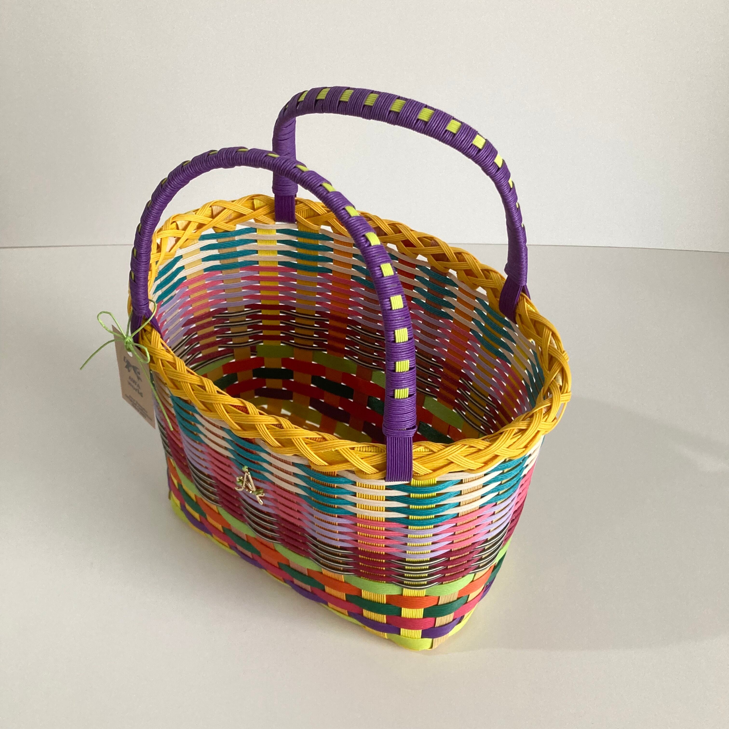 クラフトバンドで作成したカラフルで軽くて使いやすい大きさのカゴバッグです。