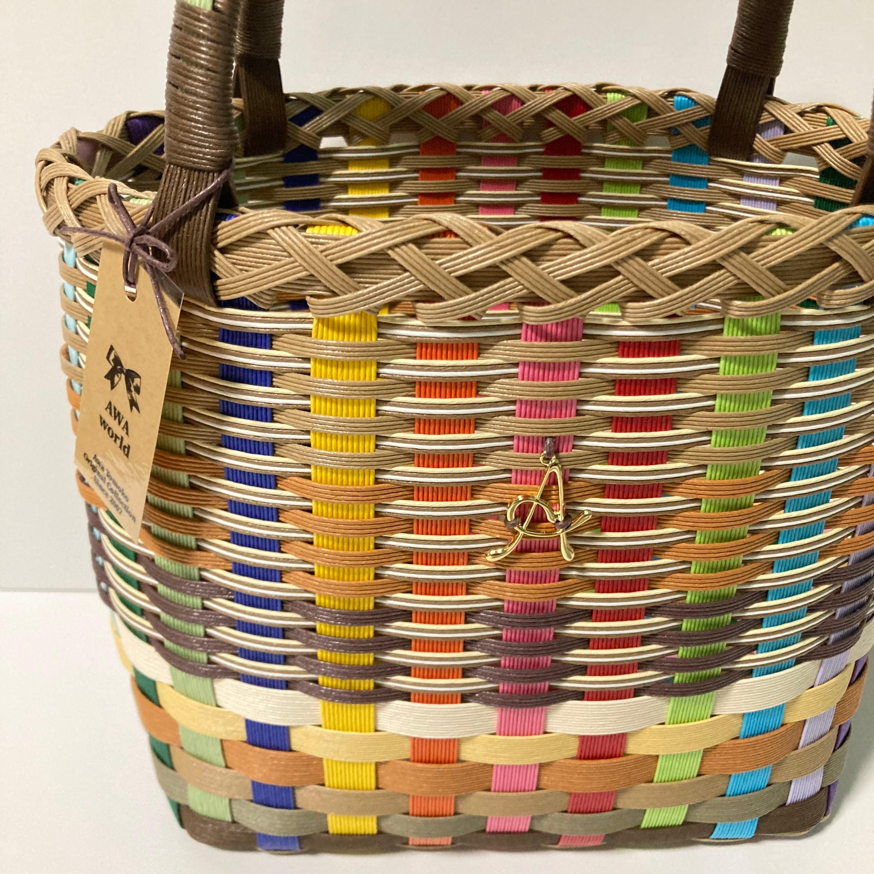 クラフトバンドで作成したカラフルで軽くて使いやすい大きさのカゴバッグです。