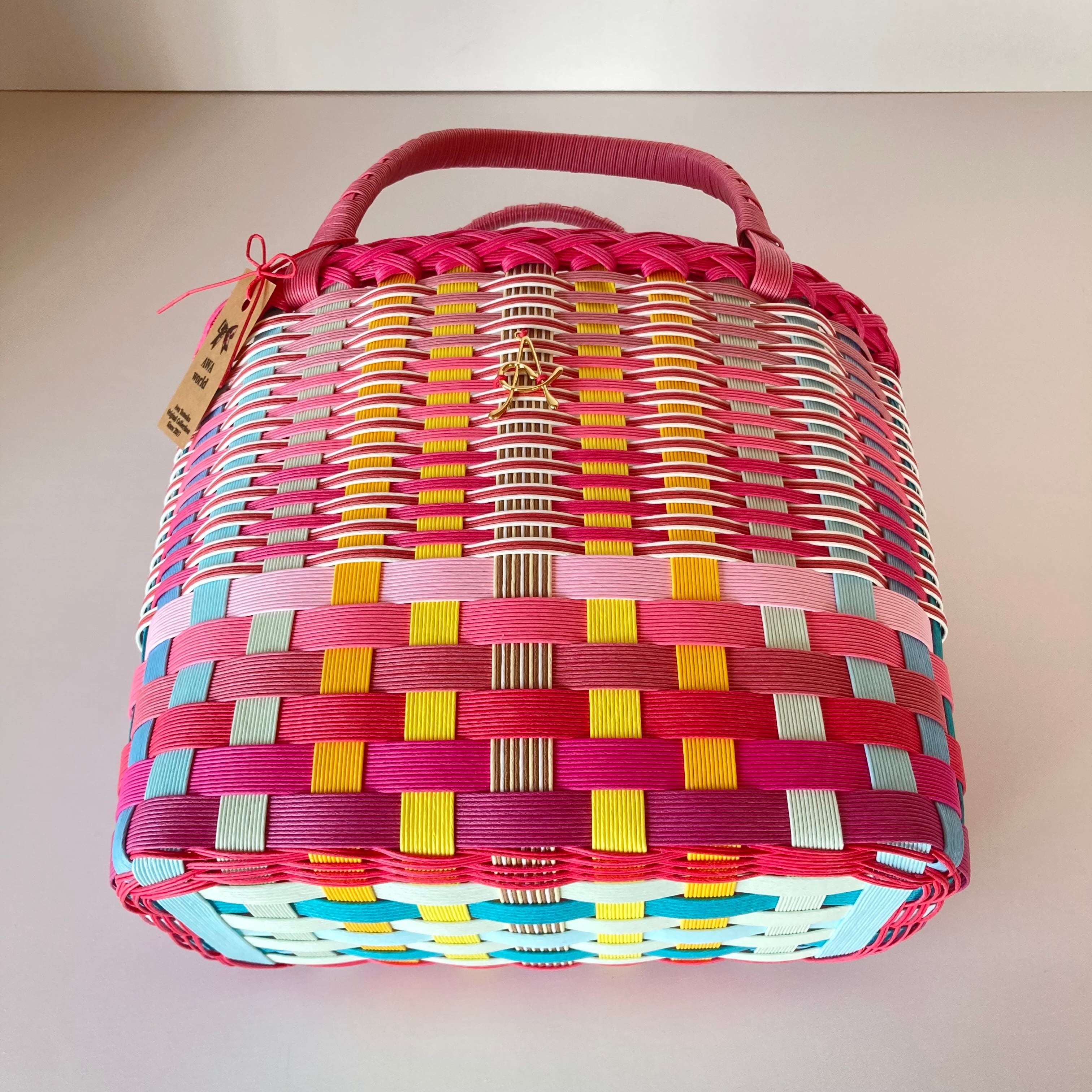 クラフトバンドで作成したカラフルで軽くて使いやすい大きさのカゴバッグです。