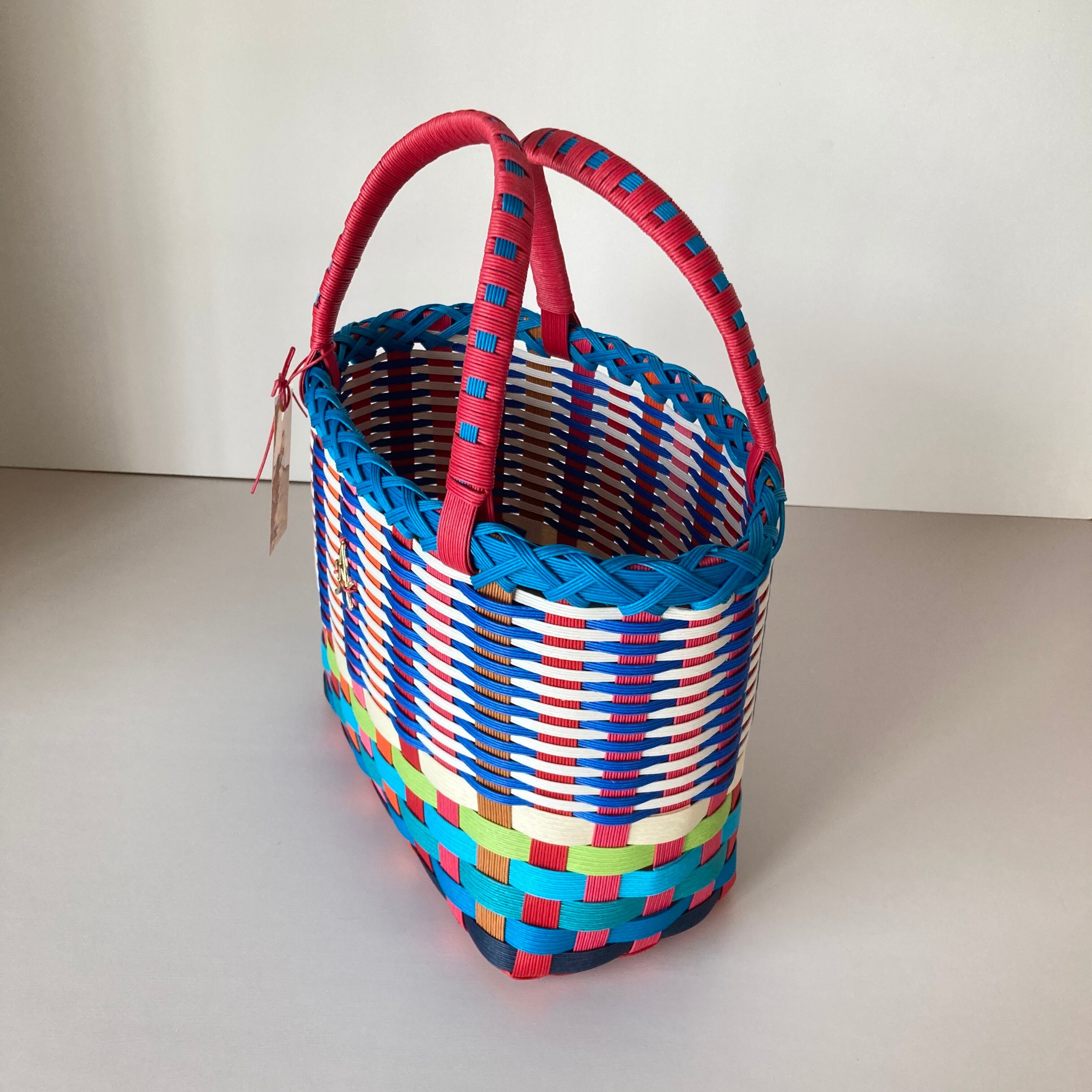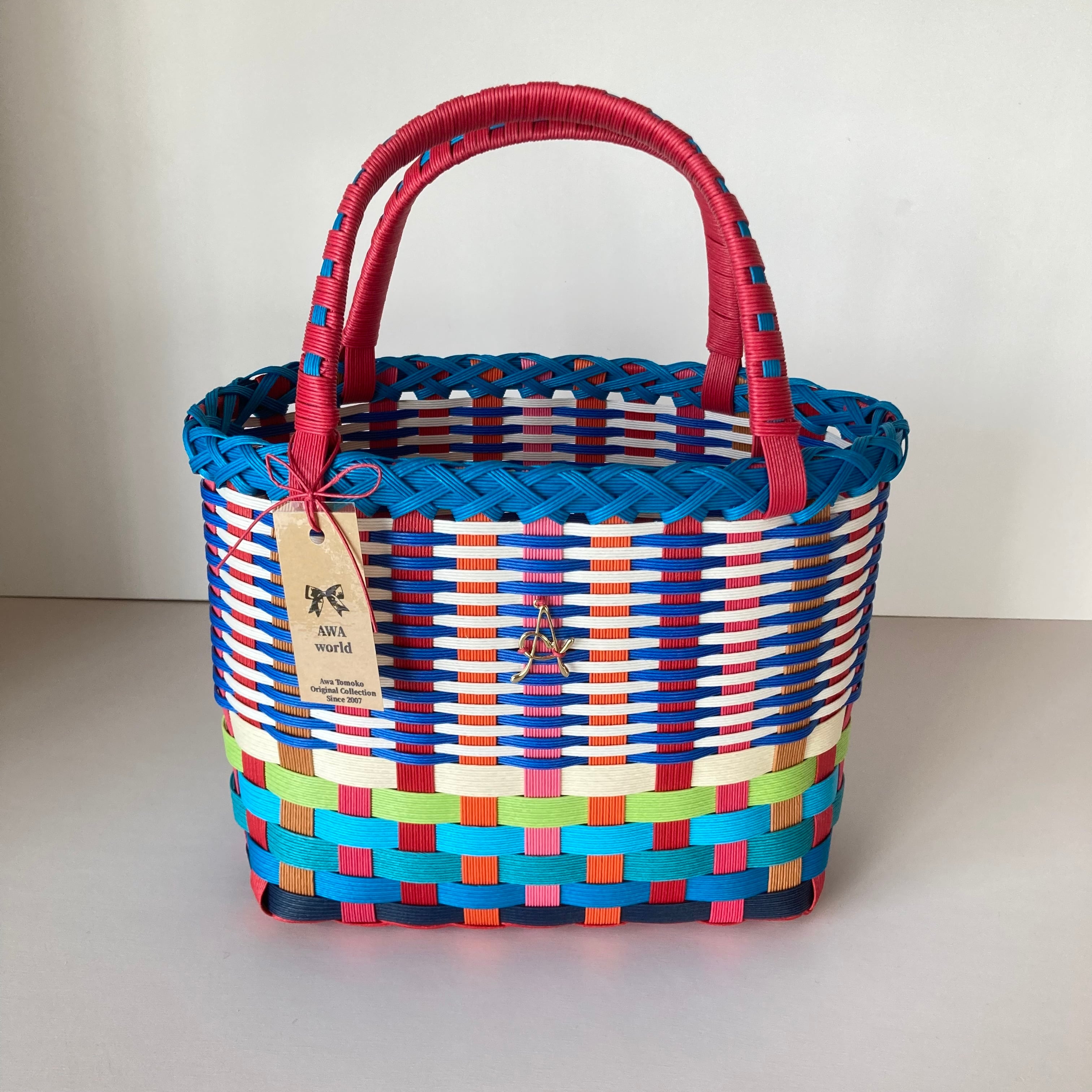 クラフトバンドで作成したカラフルで軽くて使いやすい大きさのカゴバッグです。