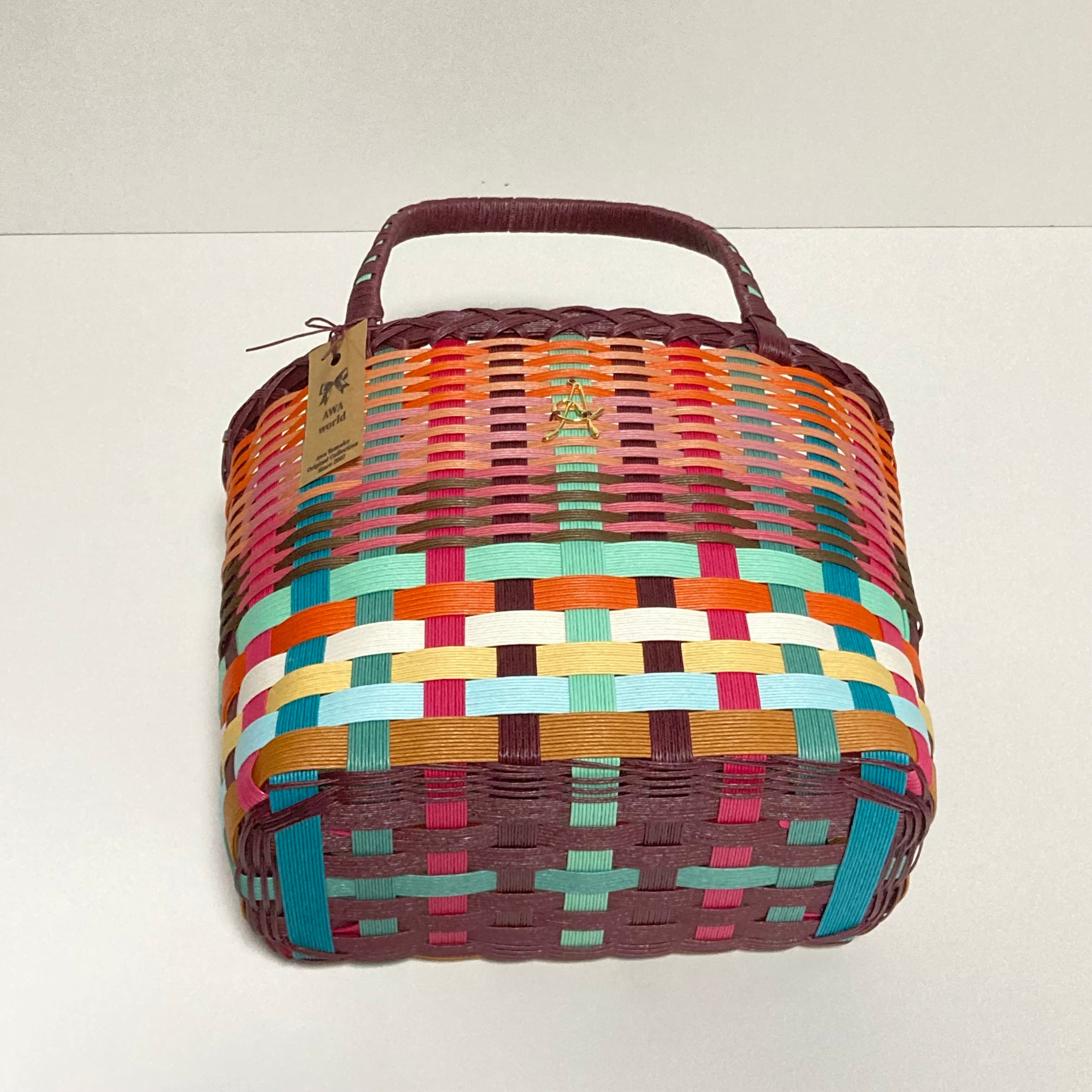 クラフトバンドで作成したカラフルで軽くて使いやすい大きさのカゴバッグです。