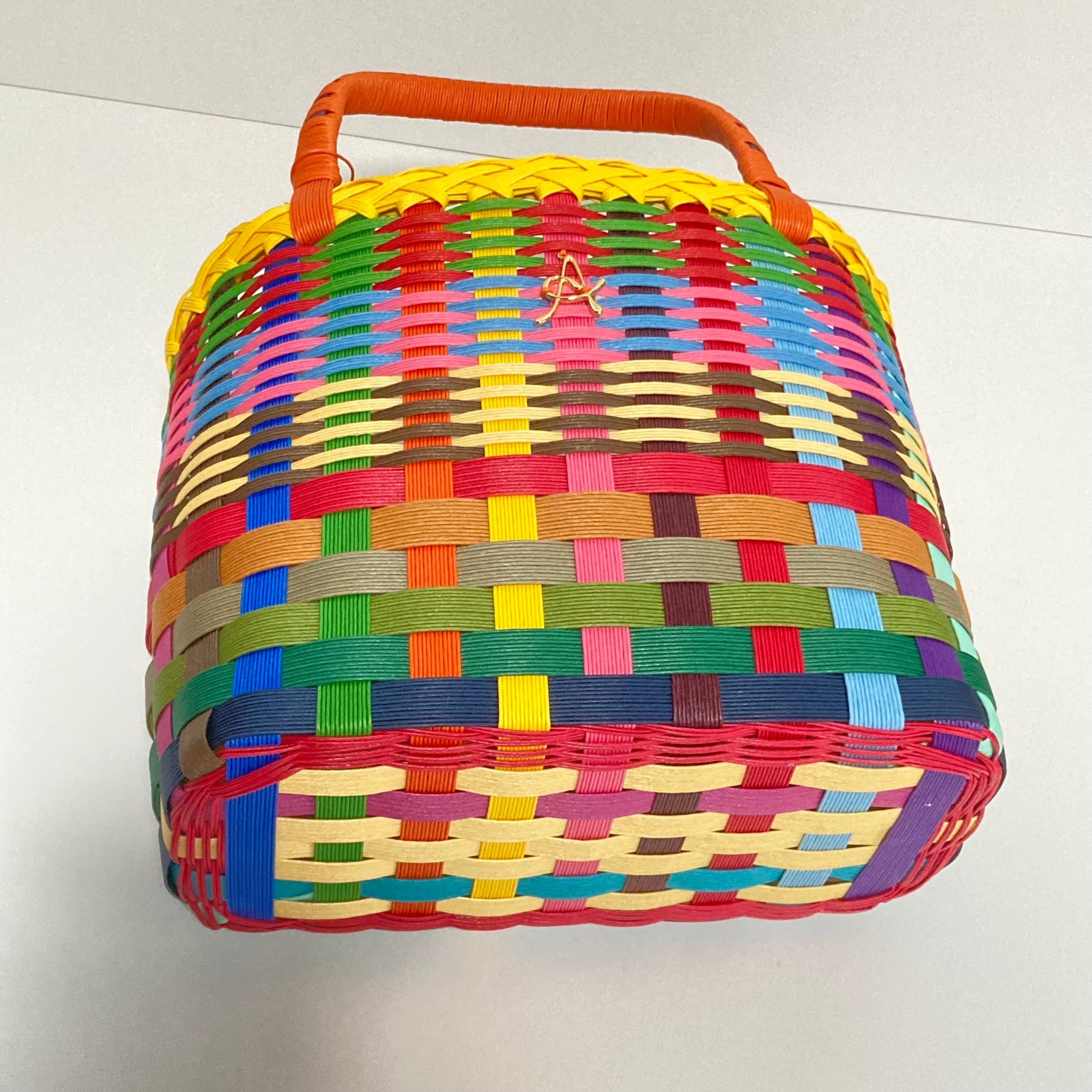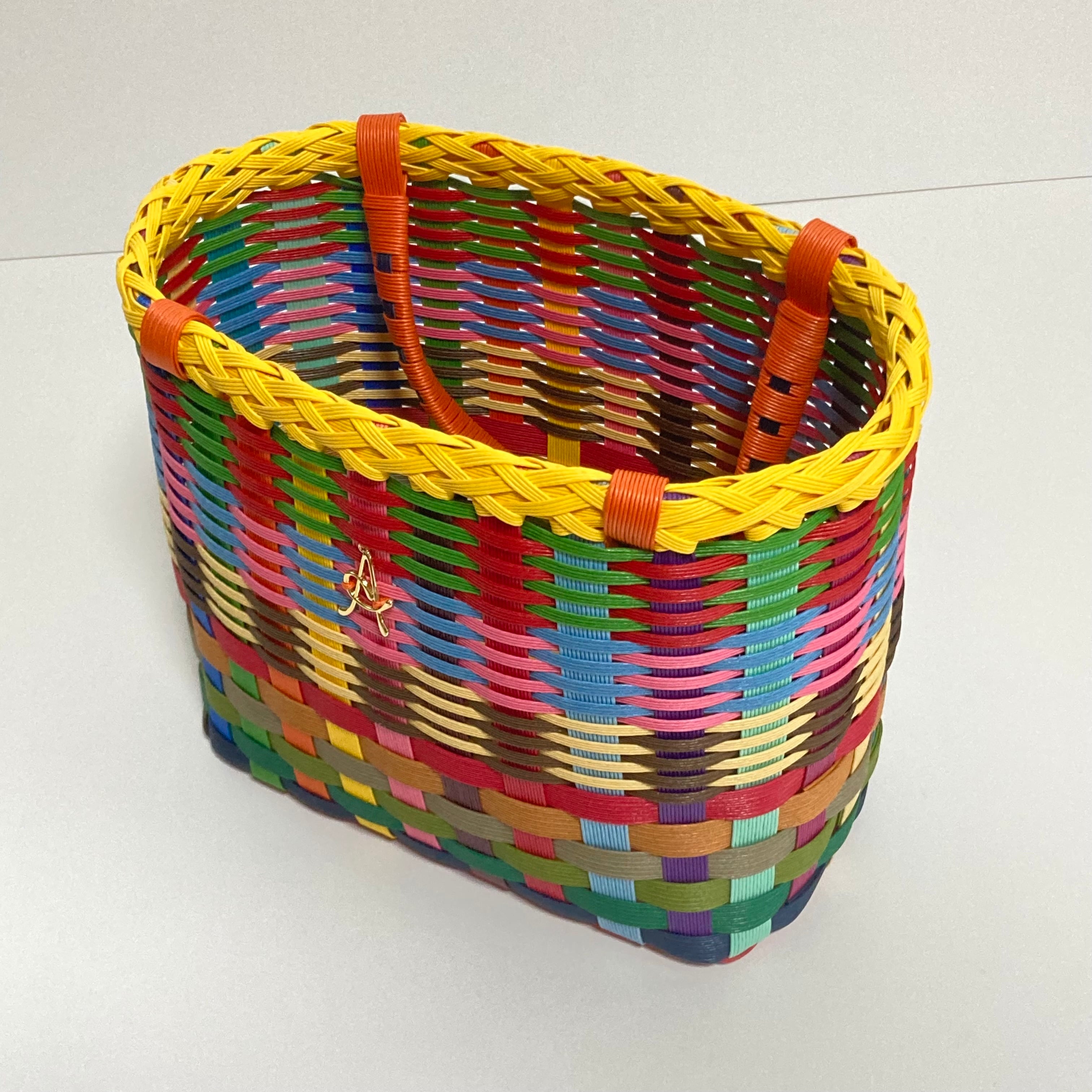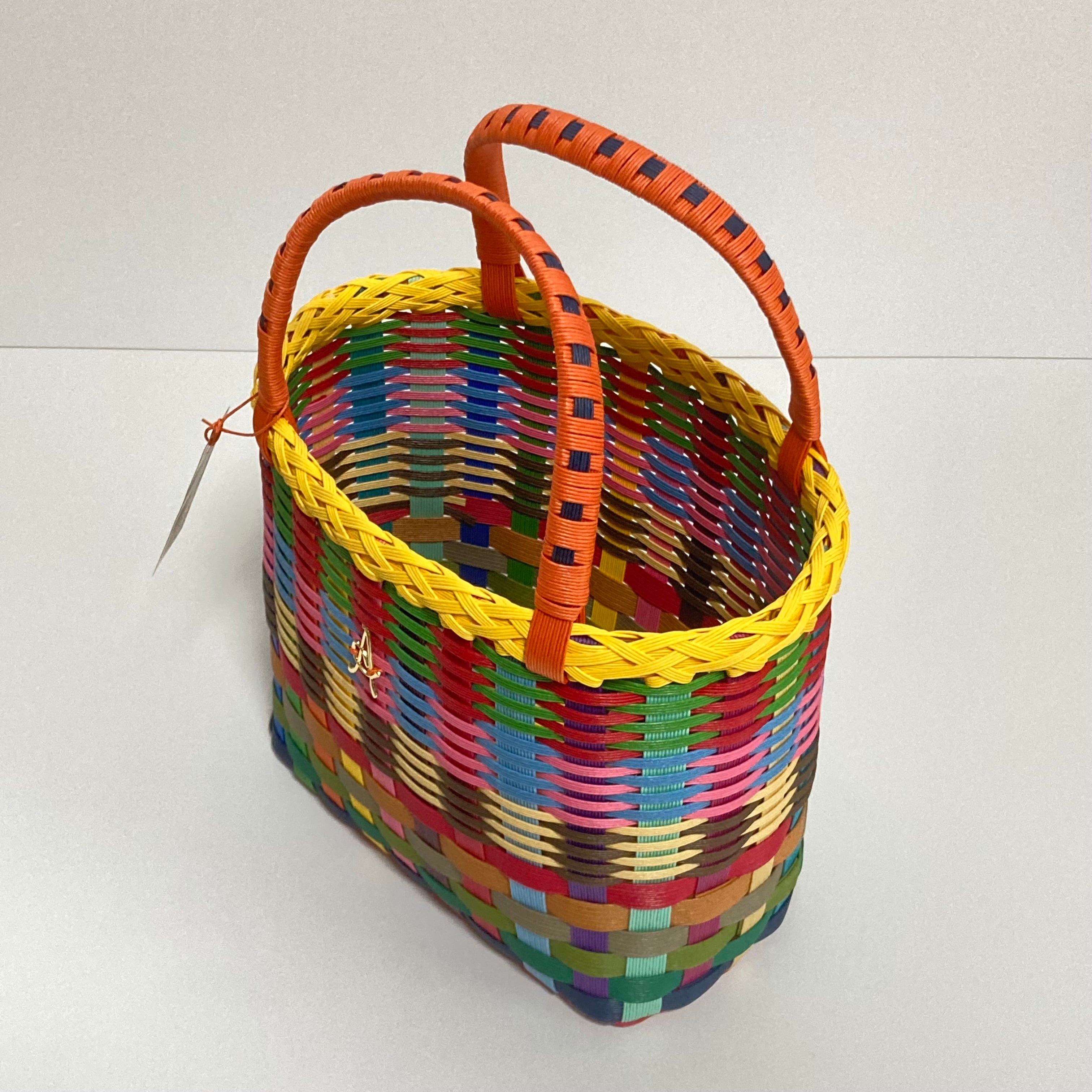クラフトバンドで作成したカラフルで軽くて使いやすい大きさのカゴバッグです。