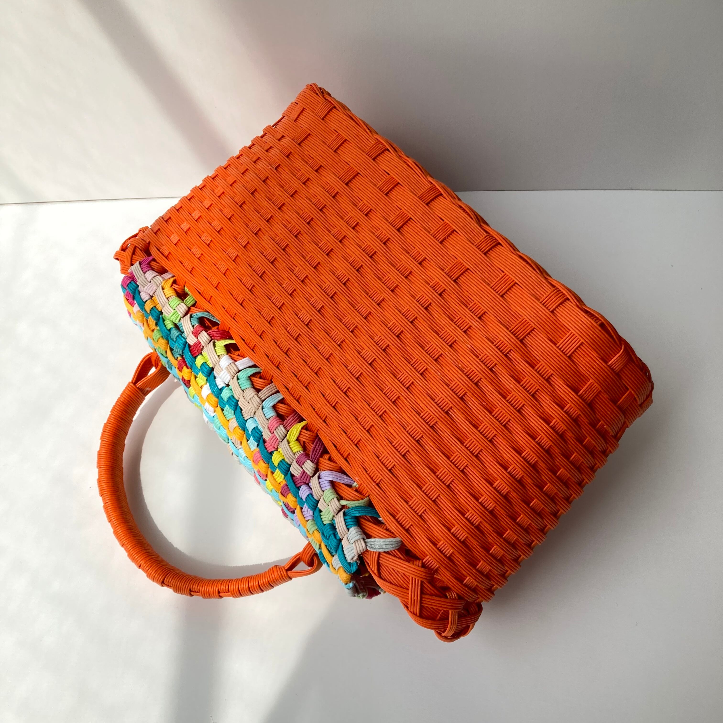 AWAworldらしいカラフルなかぶせとオレンジ色が綺麗な作品で小さめですが必要なものはちゃんと入ります。