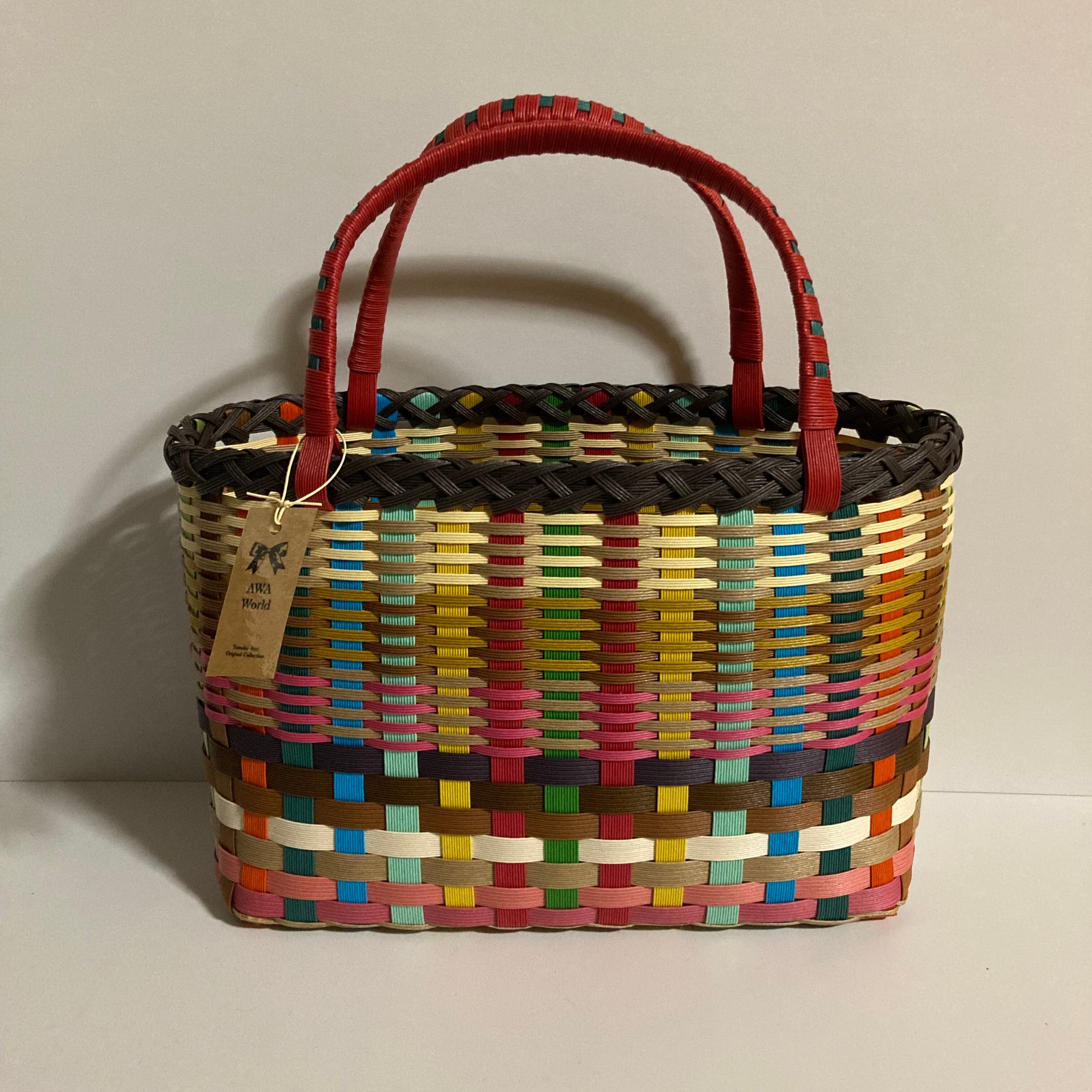クラフトバンドで作成したカラフルで軽くて使いやすい大きさのカゴバッグです。