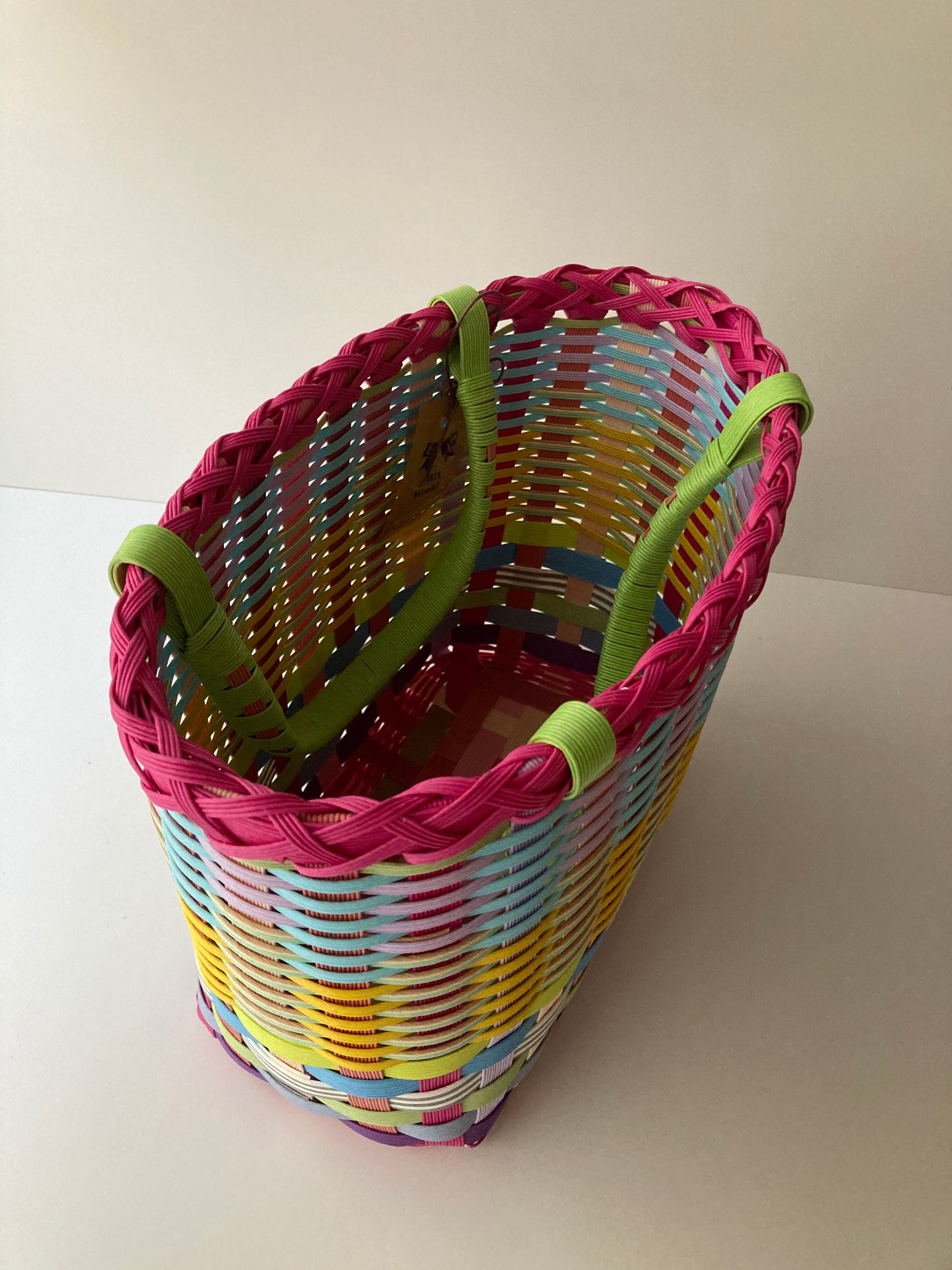 クラフトバンドで作成したカラフルで軽くて使いやすい大きさのカゴバッグです。