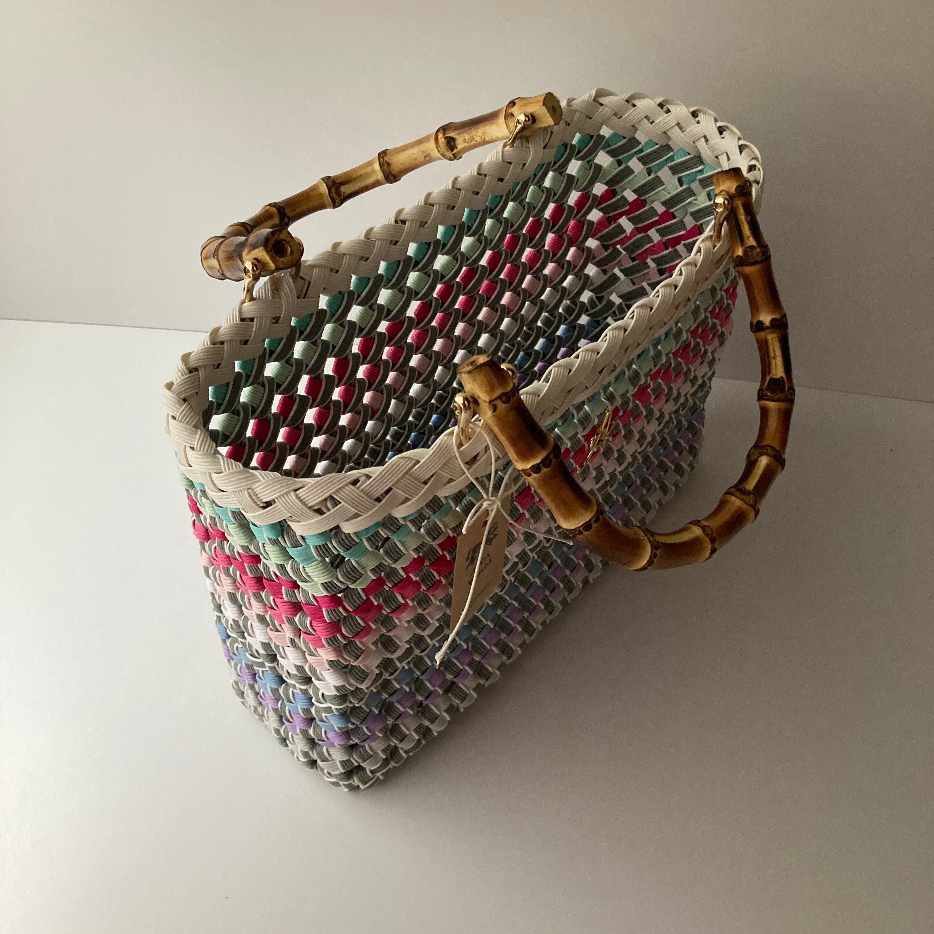 クラフトバンドで作成したカラフルで軽くて使いやすい大きさのカゴバッグです。
