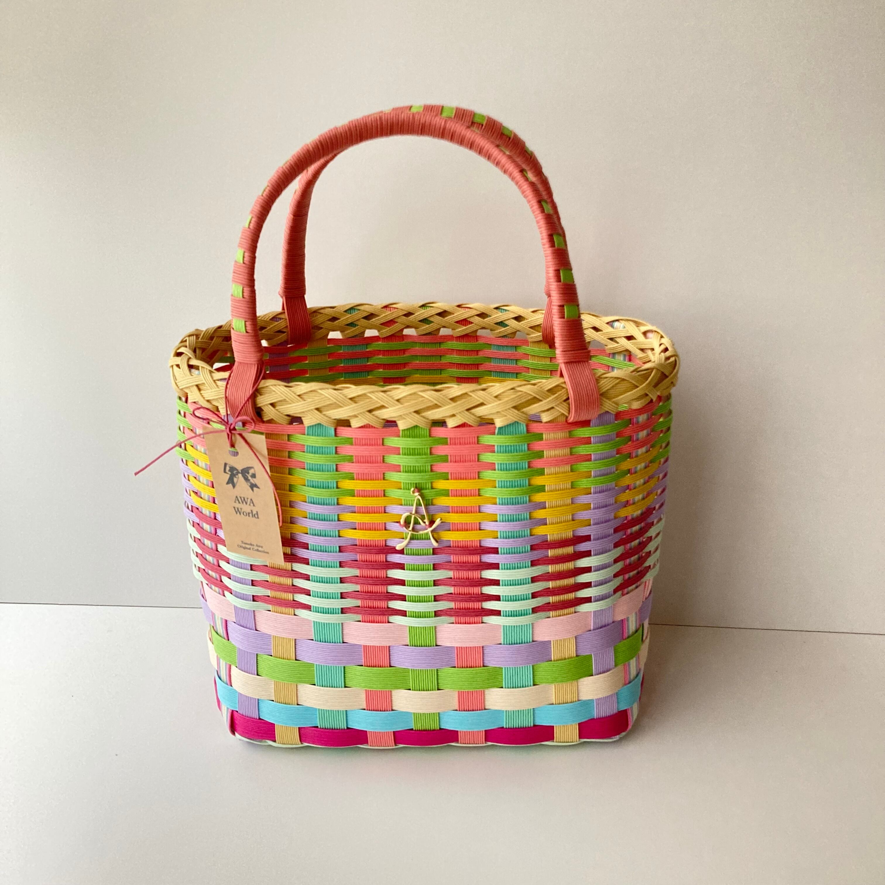 クラフトバンドで作成したカラフルで軽くて使いやすい大きさのカゴバッグです。