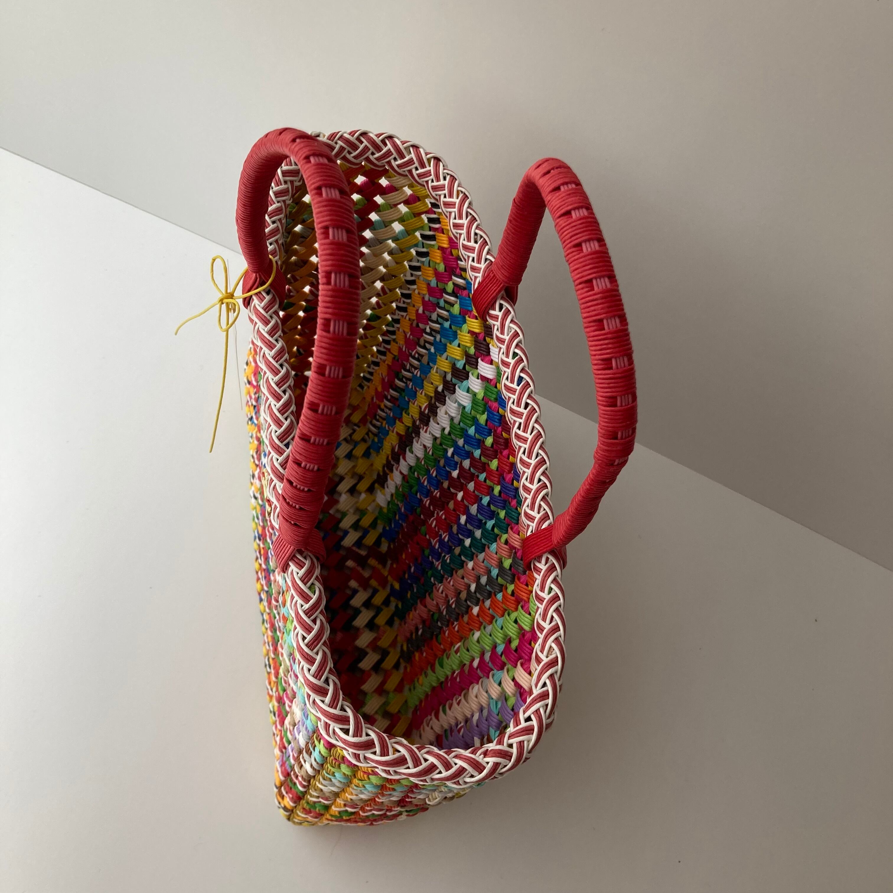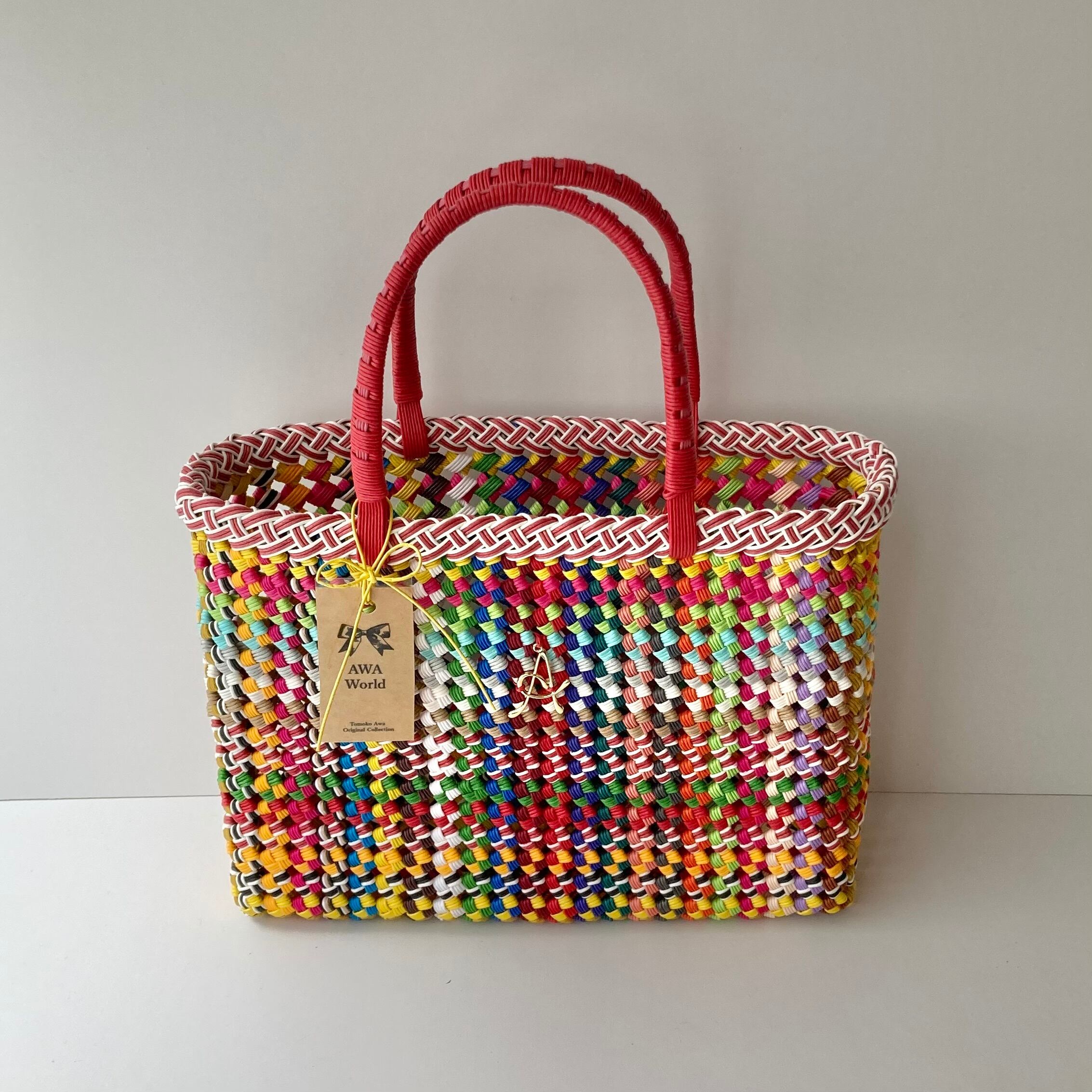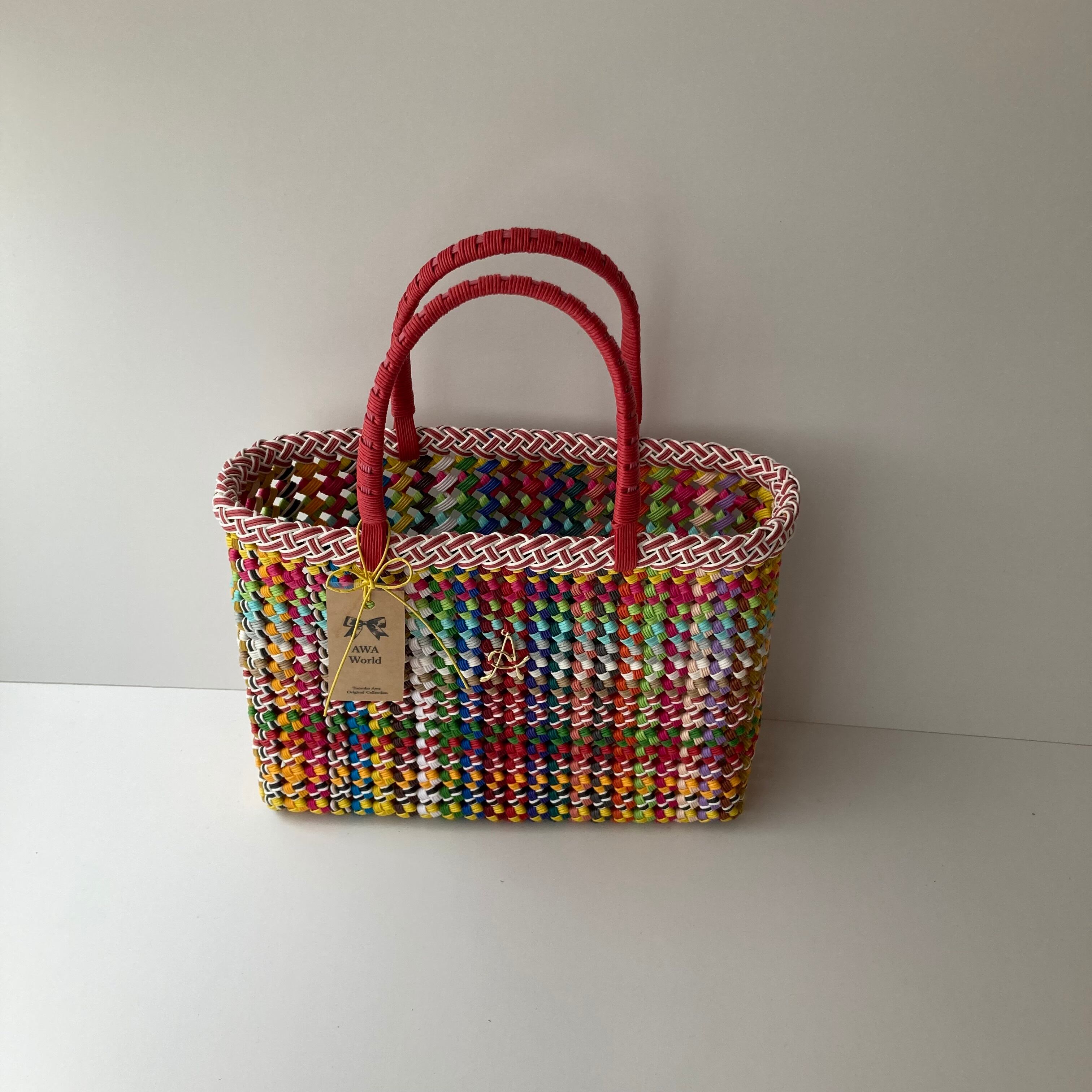 クラフトバンドで作成したカラフルで軽くて使いやすい大きさのカゴバッグです。