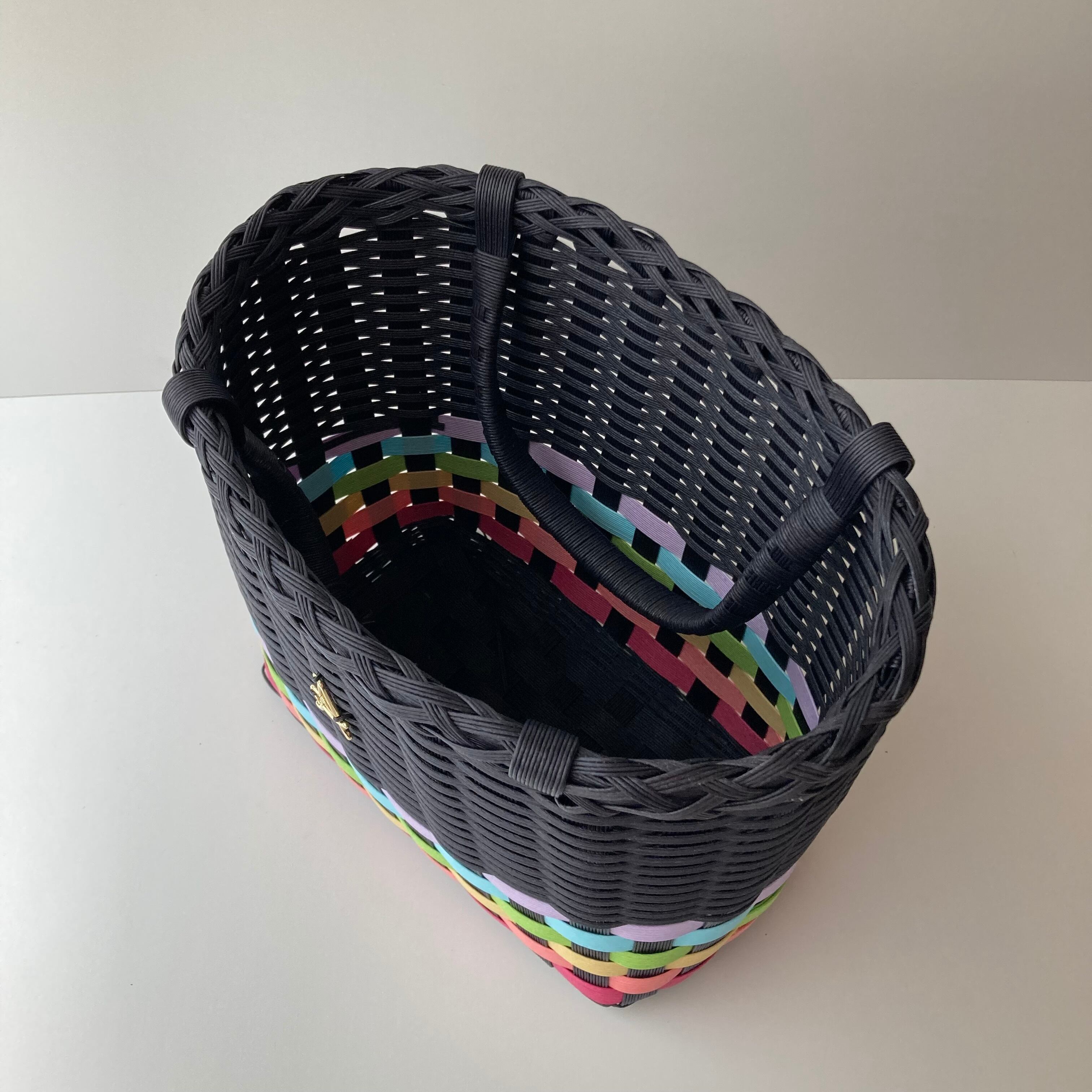 クラフトバンドで作成したカラフルで軽くて使いやすい大きさのカゴバッグです。