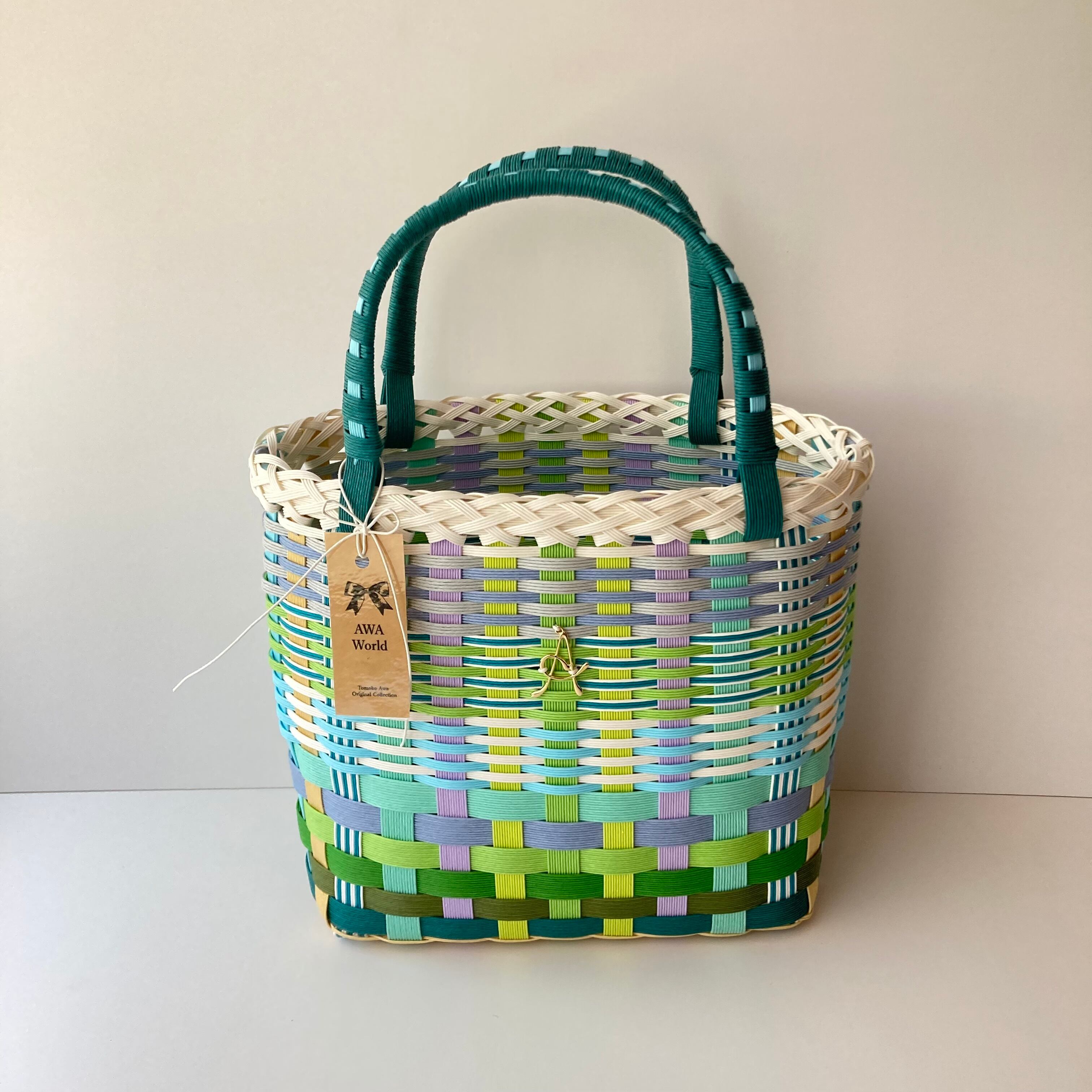 クラフトバンドで作成したカラフルで軽くて使いやすい大きさのカゴバッグです。