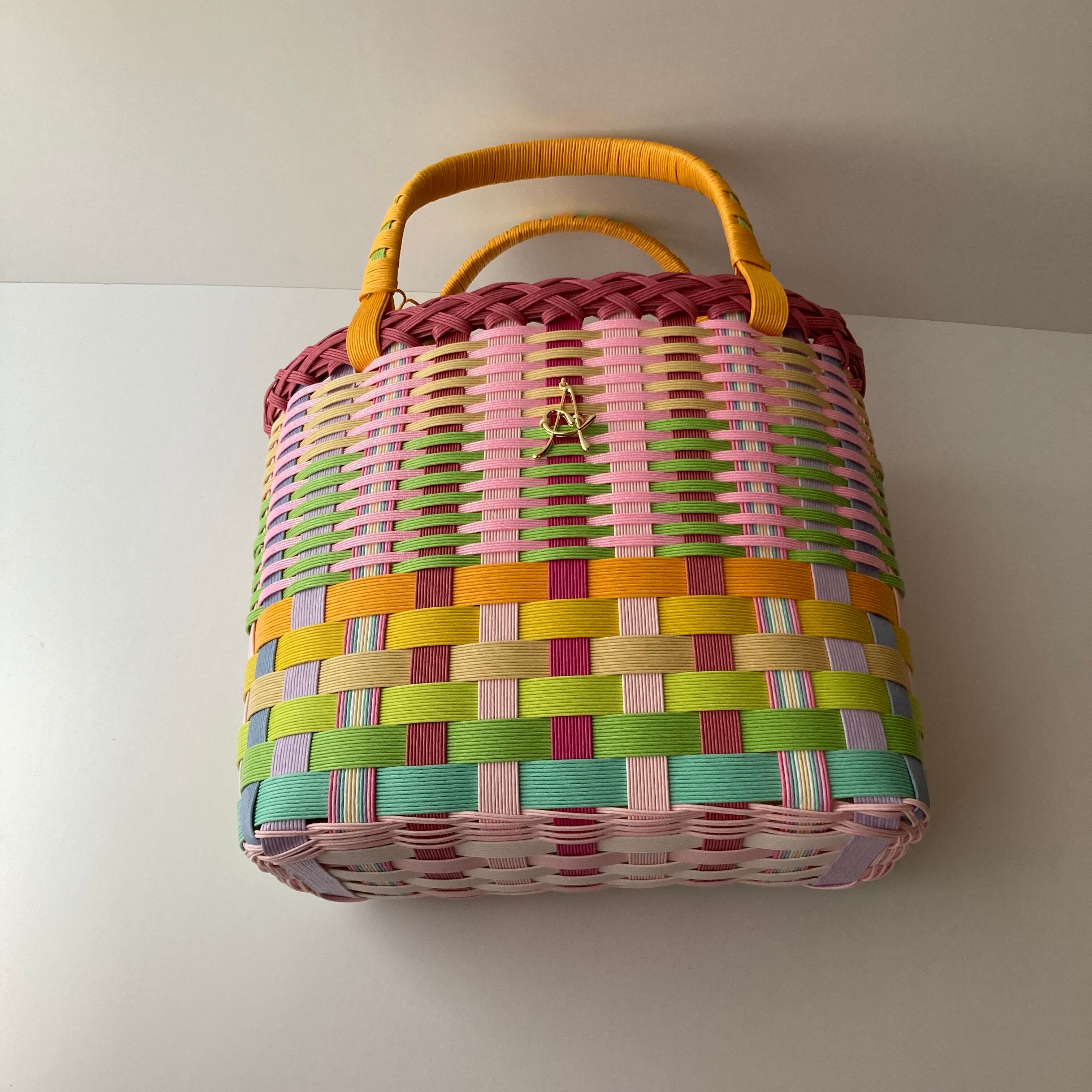 クラフトバンドで作成したカラフルで軽くて使いやすい大きさのカゴバッグです。