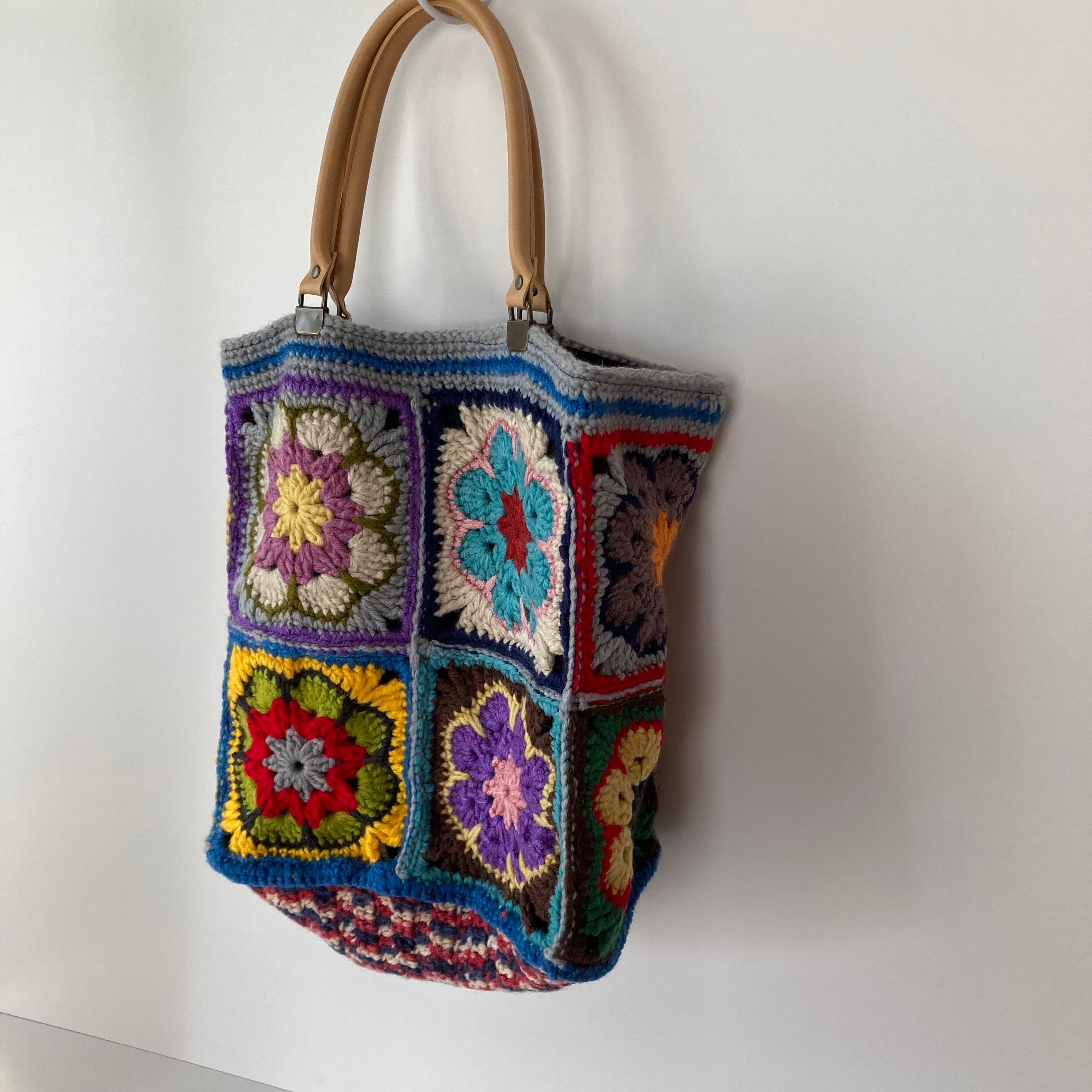 アクリル毛糸で編んだアフリカンフラワーをモチーフにカラフルに編み上げました。