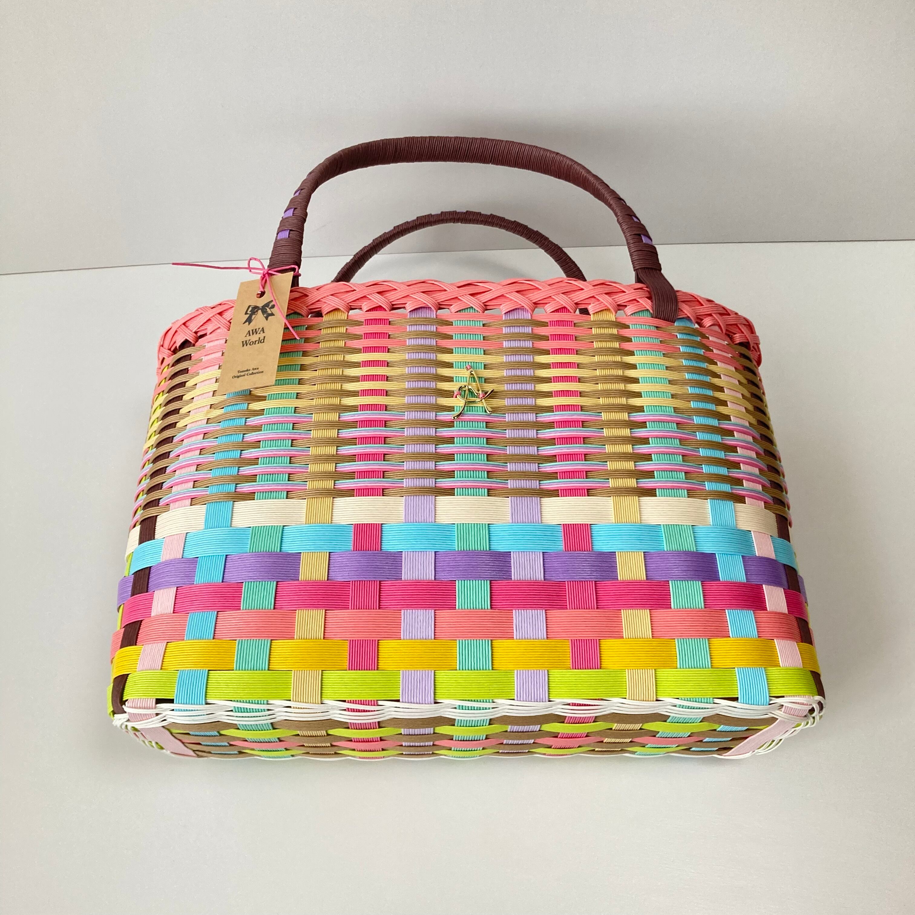 クラフトバンドで作成したカラフルで軽くて使いやすい大きさのカゴバッグです。