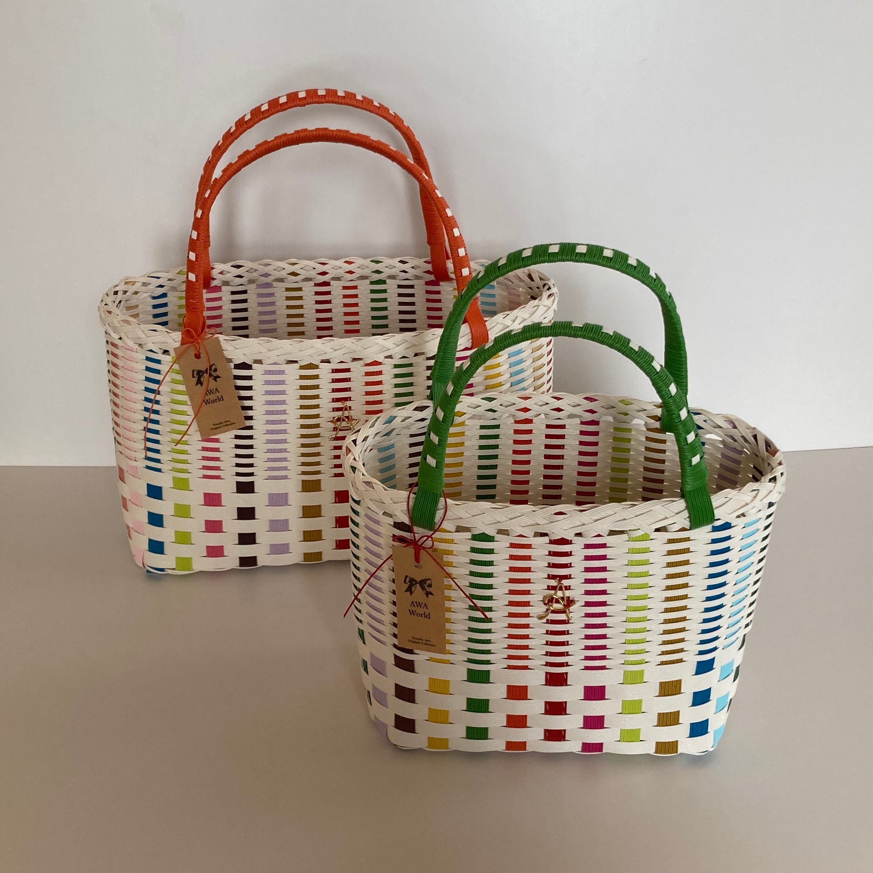 AWAworldのワイド2412 Wサイズカゴバッグは、その名の通り、広めのサイズが特徴です。たくさんの荷物を収納できるので、ママさんや荷物の多い方のお出かけに最適です。カラフルなデザインと丈夫な素材で、おしゃれさと機能性を兼ね備えたバッグです。