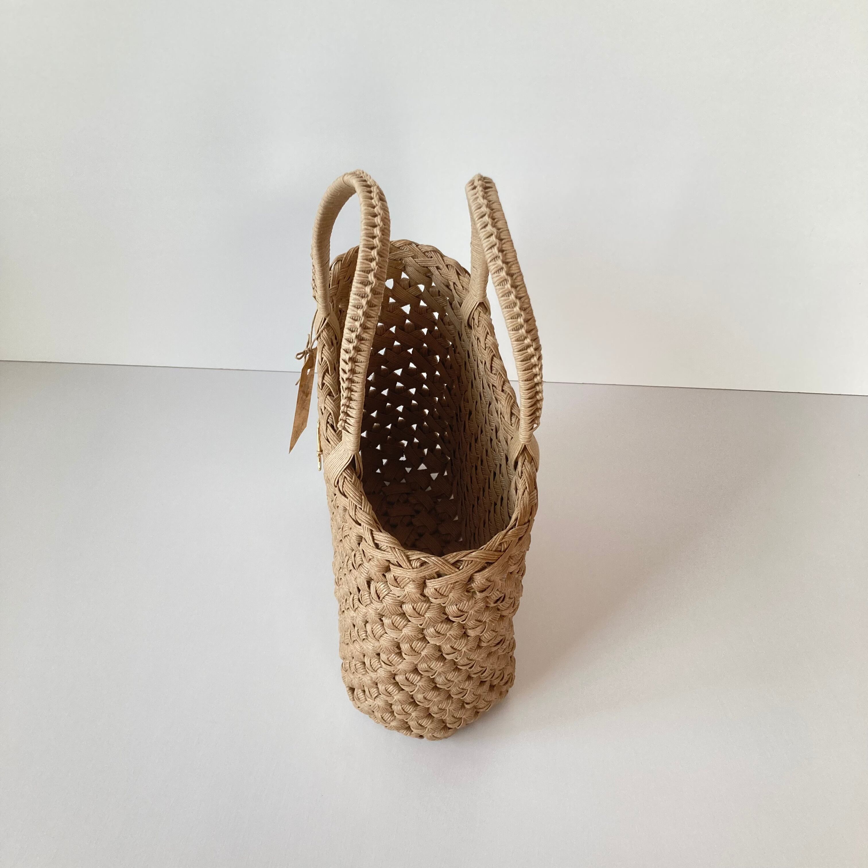 クラフトバンドで一つ一つ花結び編みをしてふちを綺麗に編み込んだバッグです。