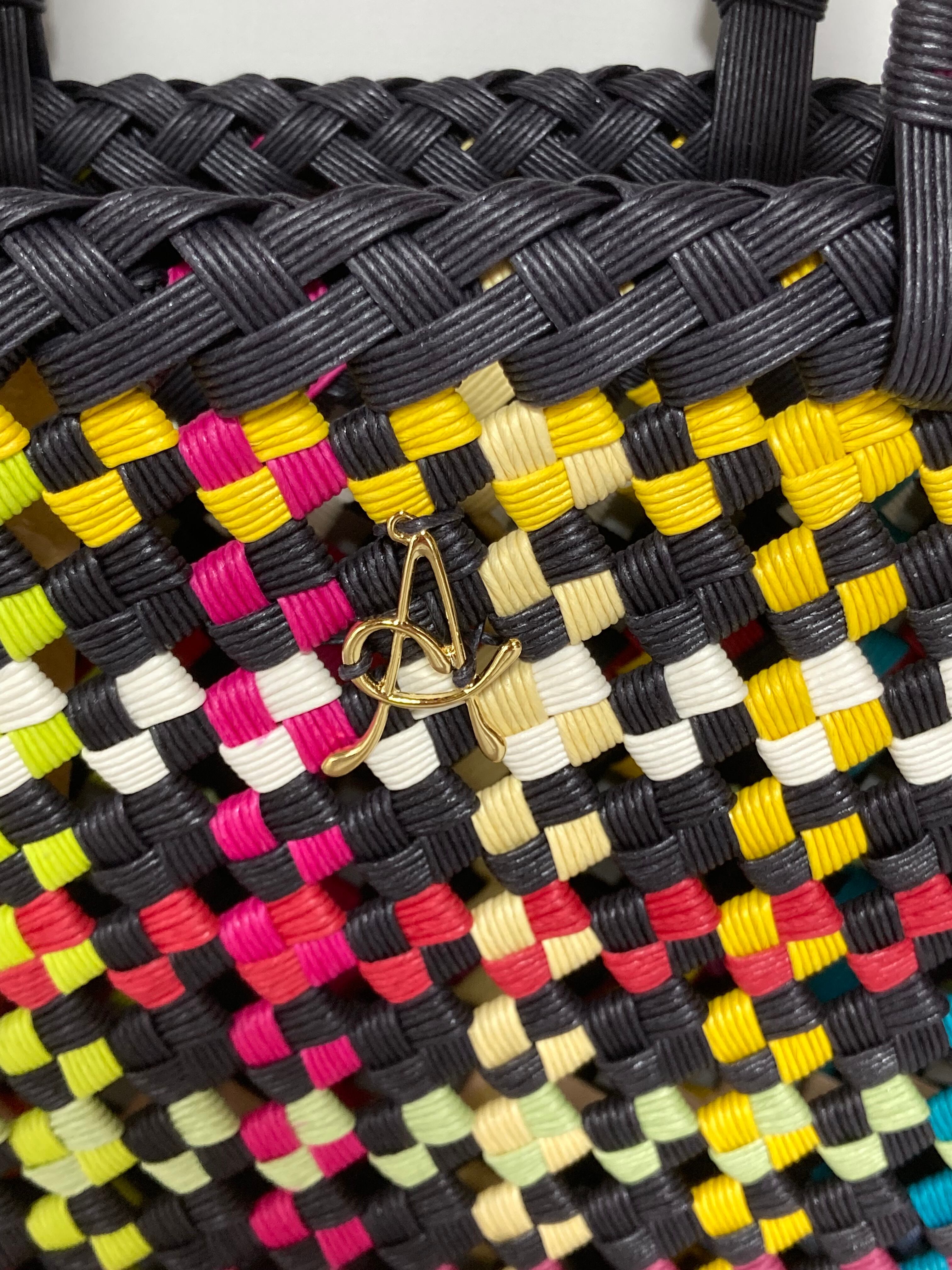 クラフトバンドで一つ一つ石畳編みをしてふちを綺麗に編み込んだバッグです。