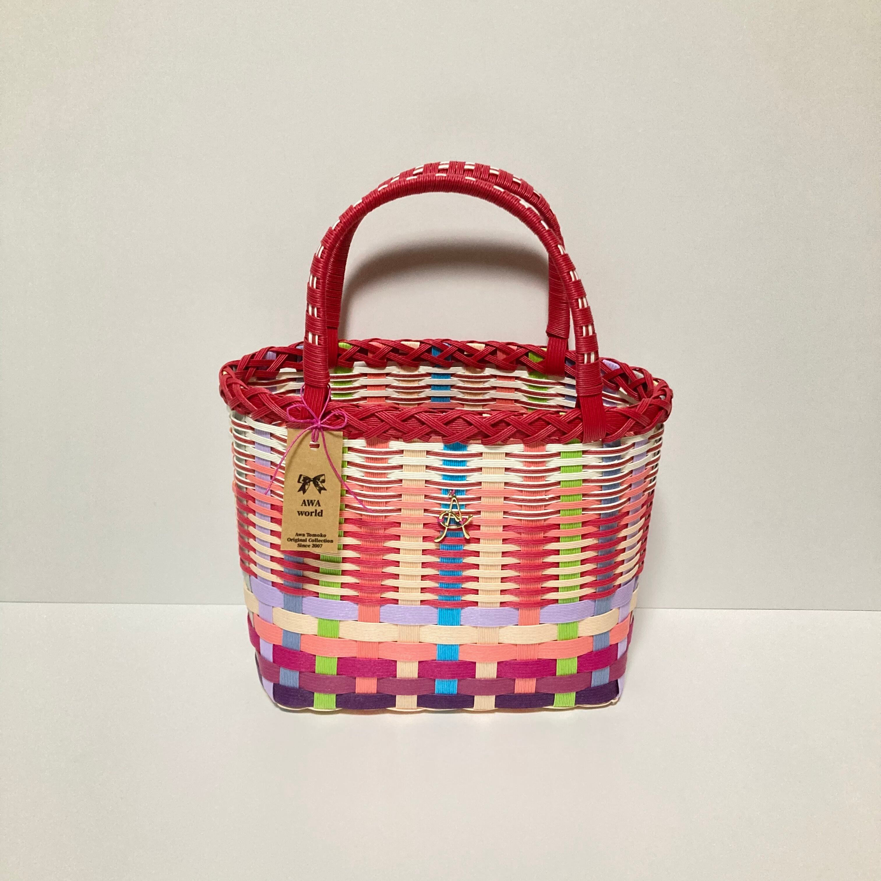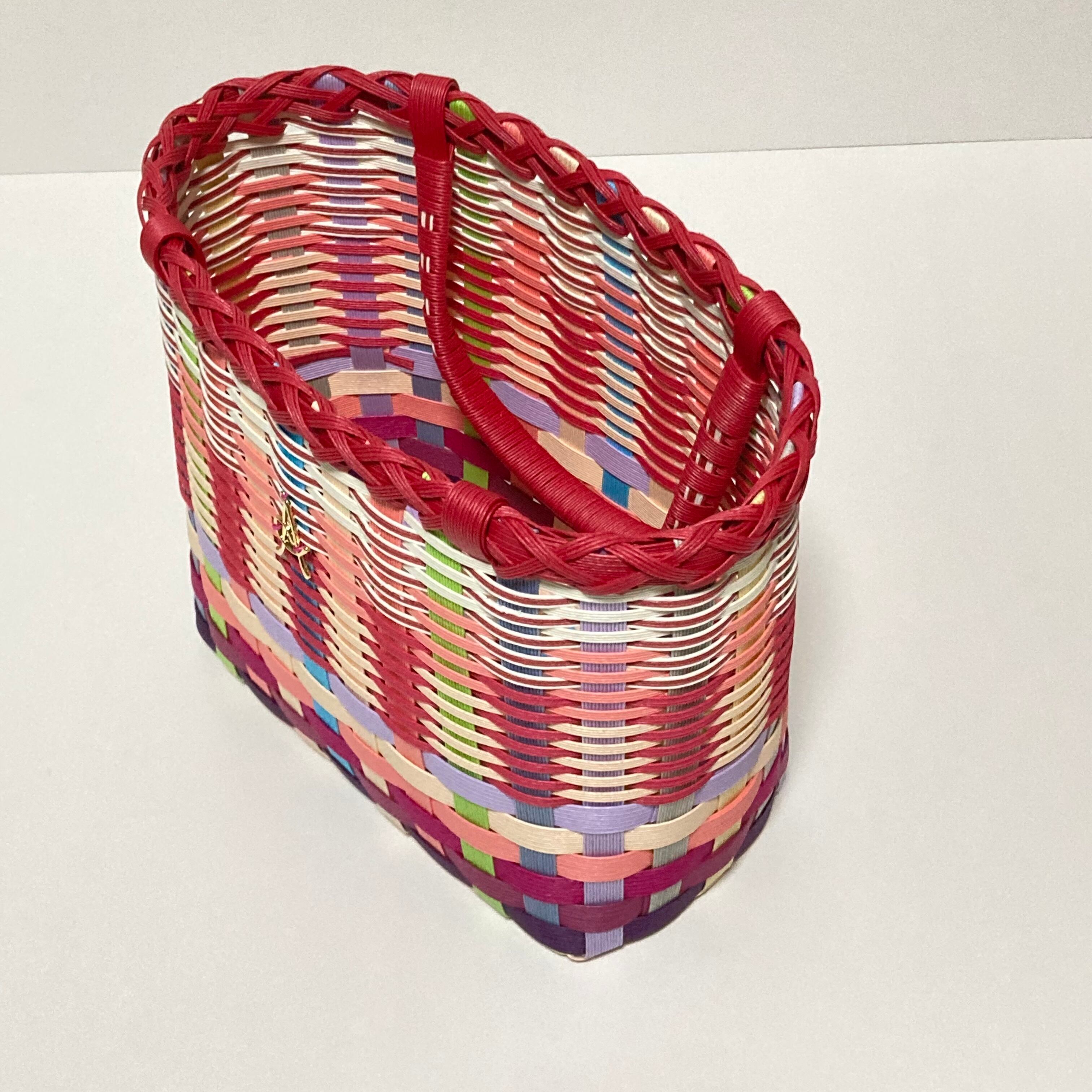 クラフトバンドで作成したカラフルで軽くて使いやすい大きさのカゴバッグです。