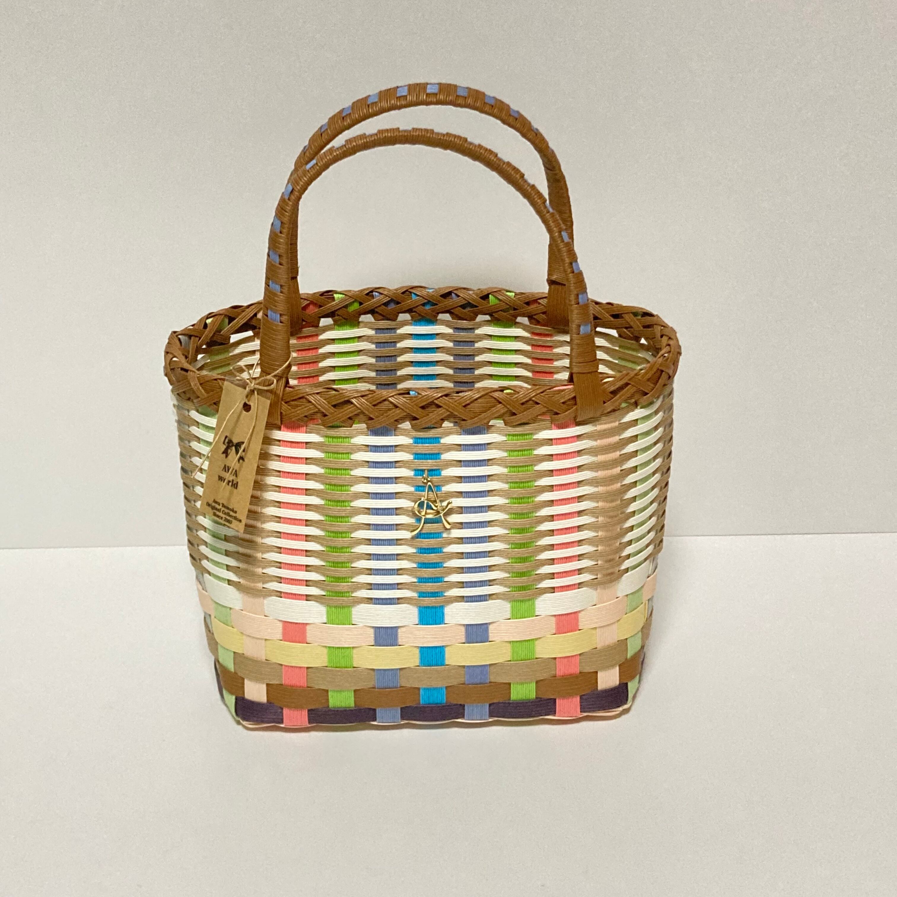 クラフトバンドで作成したカラフルで軽くて使いやすい大きさのカゴバッグです。